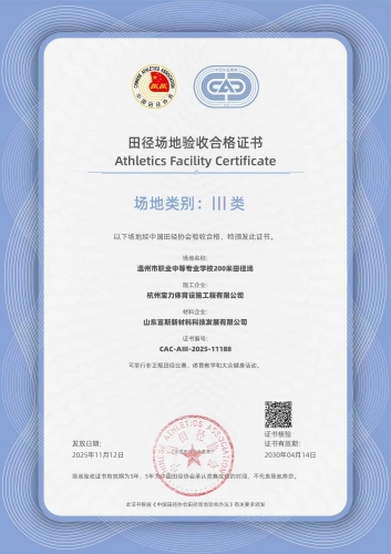 2025年11月,由杭州(zhou)宝力体育(yu)设施工程有限公司承建的温州市职业中等(deng)专业(ye)学校400米田径场项目正式通过中国田径协会验收,荣获“II类B级田径场地合格证书”。