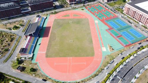 2024年由杭州宝力体育设施工程有限公司承建的温州医科大学洞头校区项目,含标准塑胶跑道、多彩看台及篮球场等,周边红砖建筑与绿化带相映,营造活力健康的校园氛围,满足多样化体育需求。