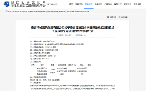 2018年7月11号中标安吉县第四小学田径场塑胶跑道改造工程项目