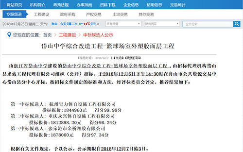 2018年12月6号中标岱山中学室外篮球场塑胶面层改造工程公示