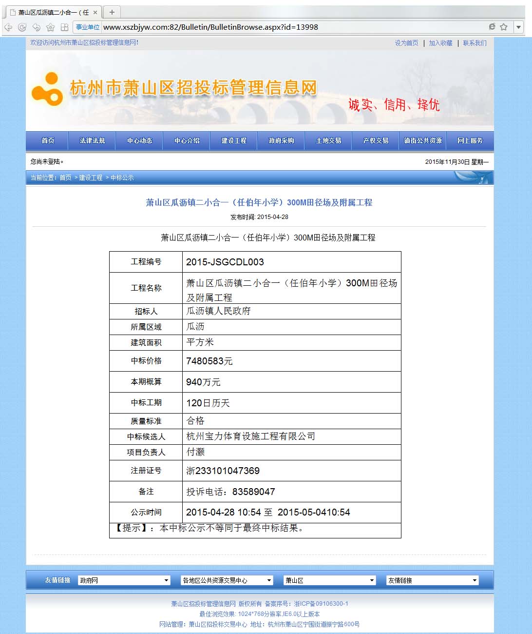2015年4月28日中标萧山区瓜沥镇二小合一(任伯年小学)300M田径场及附属工程