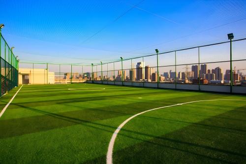 屋顶足球场人造草,指在城市建筑屋顶铺设的合成草坪足球场。其优势包括节省土地资源、低维护成本、全天候可用。采用高耐用草丝与排水系统,适配屋顶承重结构,结合减震层技术,保障运动安全,是城市空间高效利用的创新方案,推动立体运动场域发展。