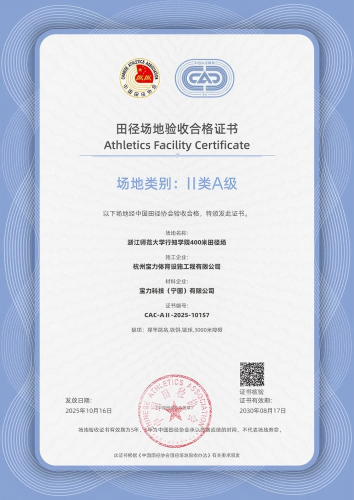 2025年11月,由杭州(zhou)宝力体育(yu)设施工程有限公司承建的温州市职业中等(deng)专业(ye)学校400米田径场项目正式通过中国田径协会验收,荣获“II类B级田径场地合格证书”。