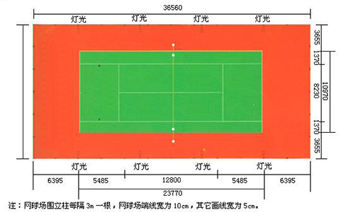 室外网球场施工公司介绍整个网球场为长方形,标准尺寸为36,560毫米(长)18,280毫米(宽),这是网球场的整体标准。