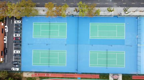 2024年由杭州宝力体育设施工程有限公司承建的舟山绿城南海实验学校400米透气型跑道项目,采用国际标准蓝色跑道搭配白色分道线;内设绿色人工草坪足球场,标线精准。周边配建红绿篮球场、标准化网球场及生态绿化带。