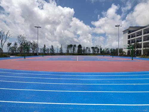 塑胶与硅PU均为篮球场常用材料,但性能差异显著。硅PU采用有机硅改性聚氨酯,弹性可调且冲击吸收率达63%,球反弹率95%,能有效降低运动损伤风险,其耐候性优异,-40℃~120℃环境下稳定,面层寿命8-10年,年均维护成本仅2-3%,但初期单价较高(100-200元/㎡)。