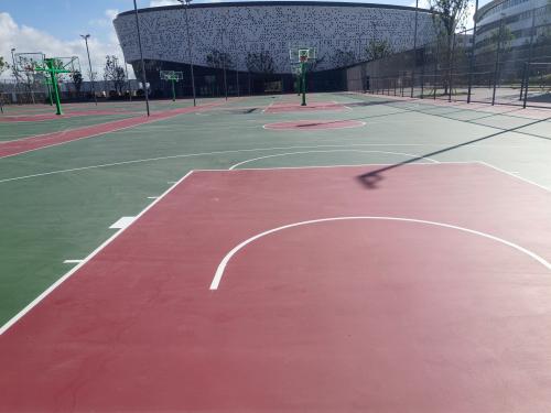 硅PU篮球场施工流程:基础处理包括磨缝、酸洗、填缝、底涂及找平修补,确保平整度≤3mm;硅PU层施工分弹性层(4mm)、加强层(4mm石英砂混合)及面层(纯硅PU喷涂两遍);最后按国际标准划线。