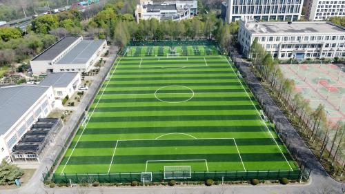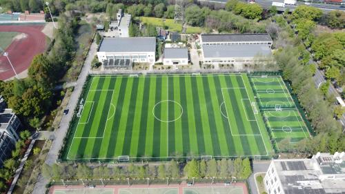 足球场人造草坪由基础层、缓冲层、草坪层及填充物构成。基础层多为混凝土或沥青,要求坚实平整;缓冲层采用橡胶或泡沫塑料,提供弹性;草坪层以聚乙烯或聚丙烯仿真草丝编织而成,模仿天然草质感。