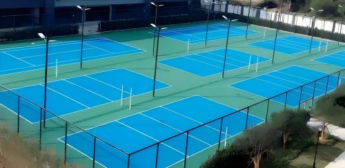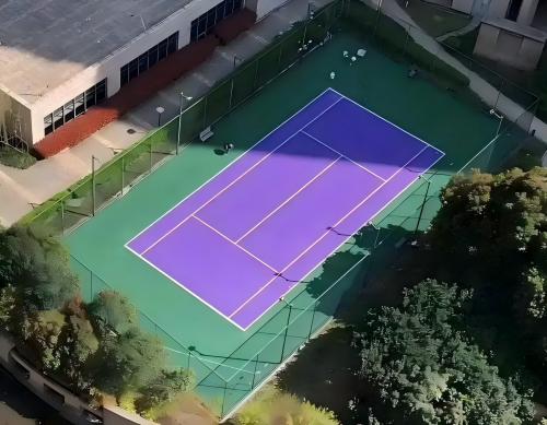 网球场硅PU地面翻新施工方案摘要:首先清理破损区域,打磨平整并涂刷底漆增强粘结力;分层涂装硅PU弹性层及面层,确保厚度均匀;最后精准划线并保养。施工期间保持场地干燥,控制环境温度5-35℃,材料充分固化后验收,重点检查平整度、弹性及防滑性能。
