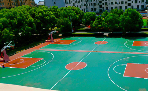 杭州篮球场铺装主要是在地基层铺设好后对底胶的铺装和对面胶的摊铺两个步骤: