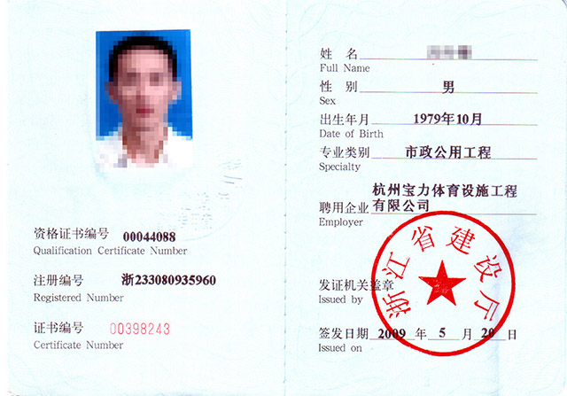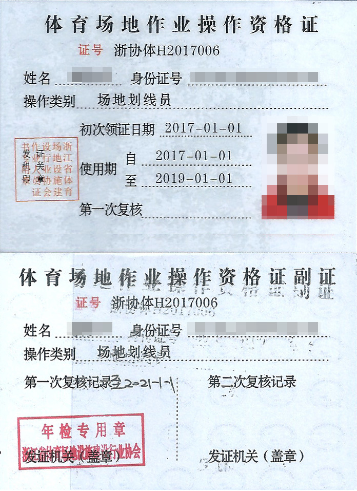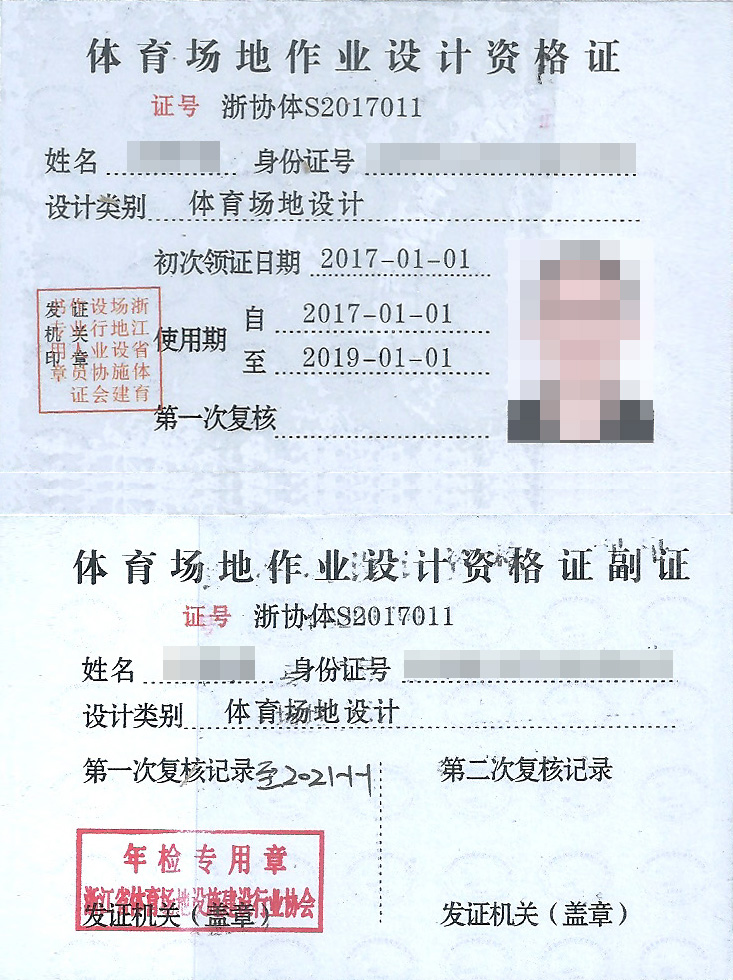 市政贰级、房建贰级、装修装饰贰级、体育设施二级、体育设施行业协会能力认证一级,人员配备---建造师15个,具备施工员、安全员、质量员、材料员、资料员、劳务员、标准员、机械员,中国田径协会划线师、体育场地设计员、塑胶机操员。