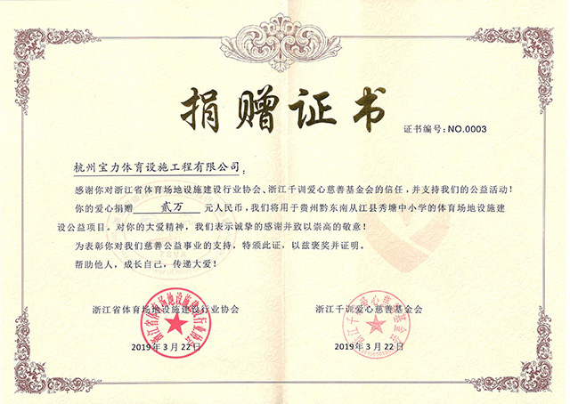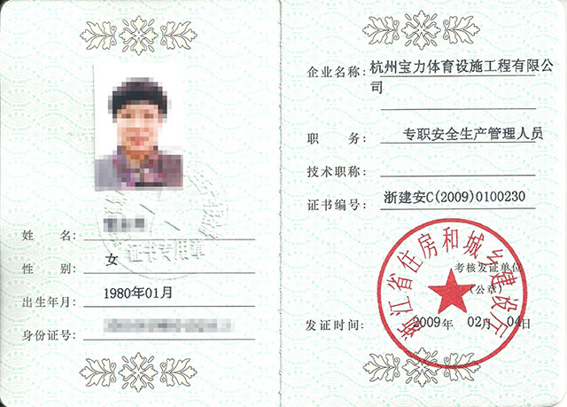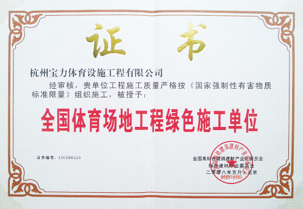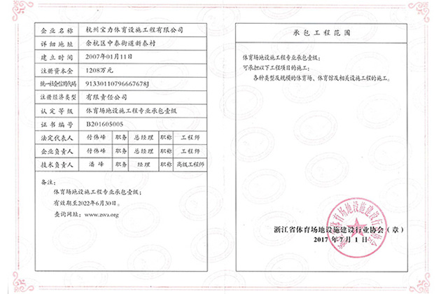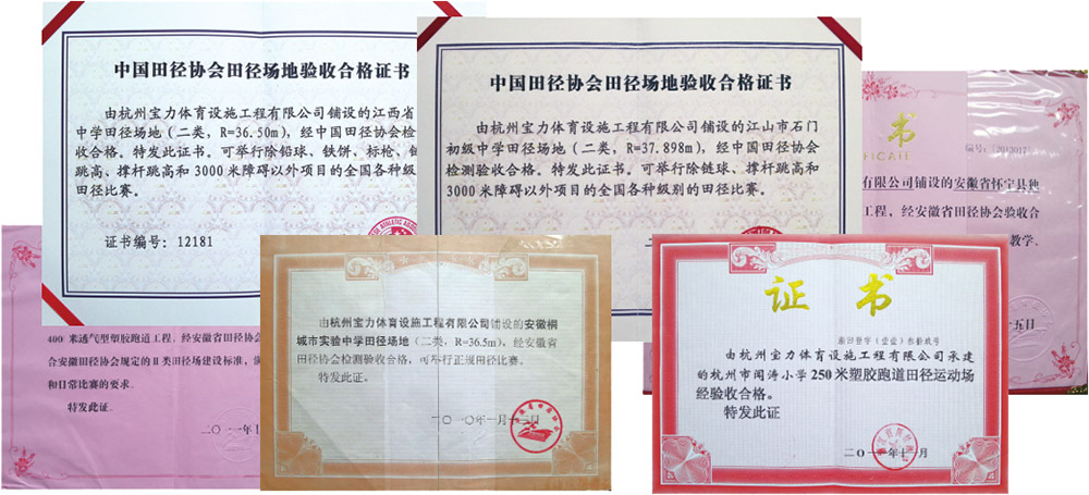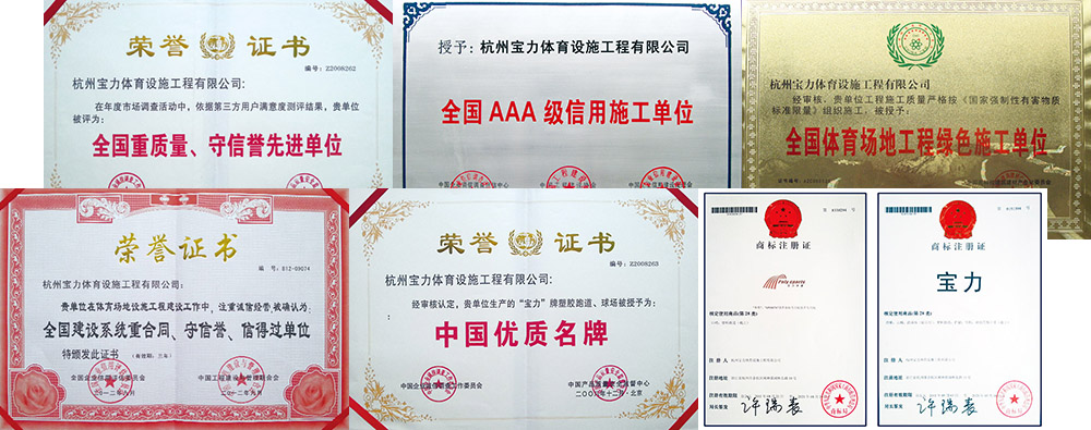 宝力16年塑胶跑道、塑胶篮球场施工经验、08年奥运会铁人三项预制型塑胶跑道建设,体育设施行业一级能力认证、12项施工设备专利、中国田径协会会员、同时具备体育设施市政房建资质、全国体育场地工程绿色施工单位。