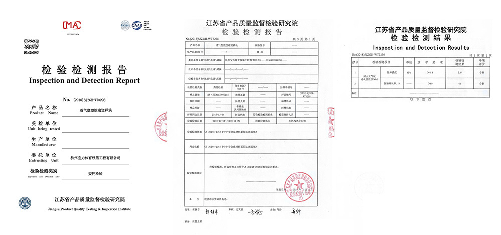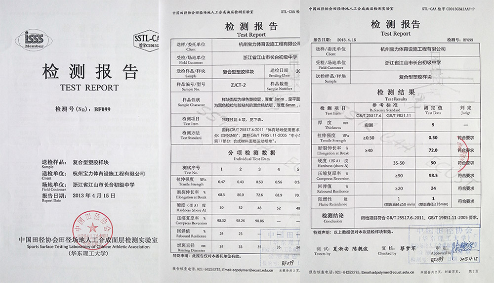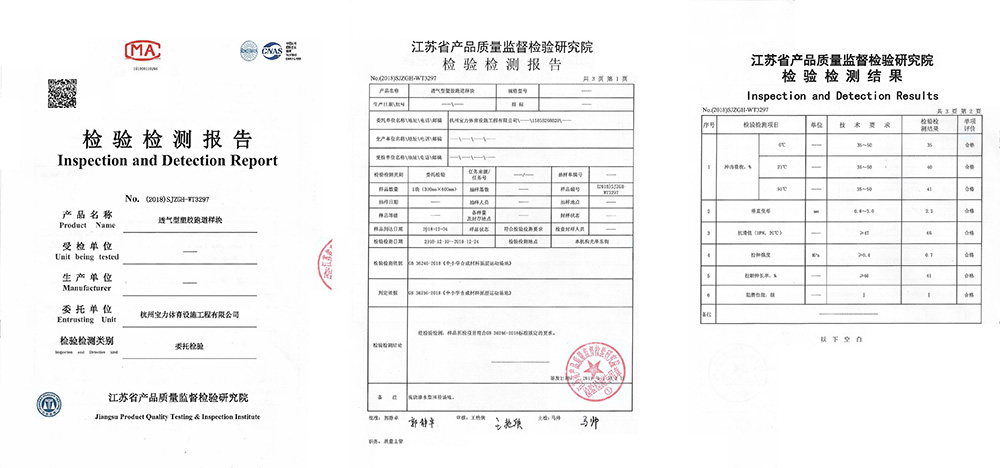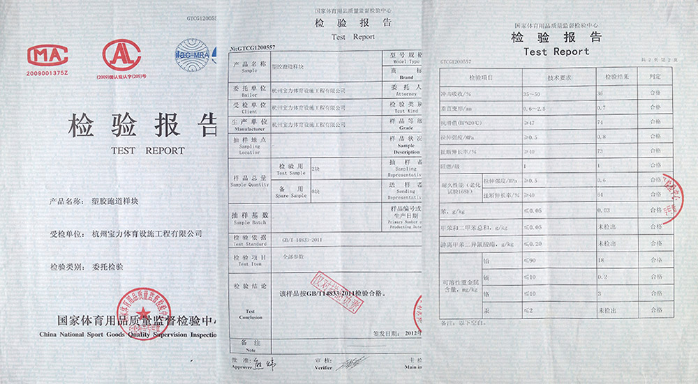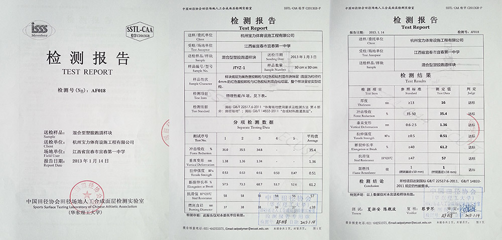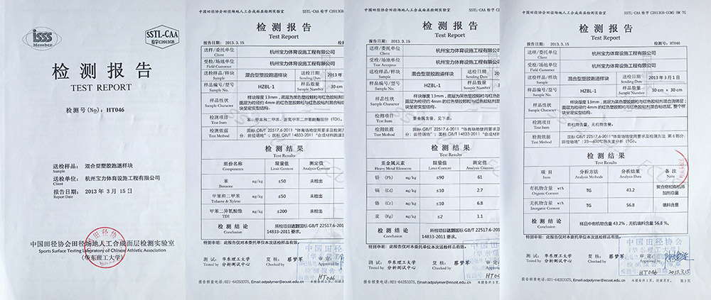 三大体系认证(iso9001质量管理体系、ISO14001环境管理体系、ohsas18001职业健康安全管理体系)通过中国田径协会指定检测机构化学性能物理性能检测