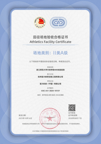 2025年10月,由杭州宝力体育设施工程有限公司承建的浙江师范大学行知学院兰溪校区400米田径场项目,正式通过中国田径协会验收并获颁“II类A级田径场地合格证书”。这一成果标志着该场地在跑道厚度、设施配置、施工质量等方面全面符合国家级标准,成为浙江省内高校体育场地建设的标杆案例。