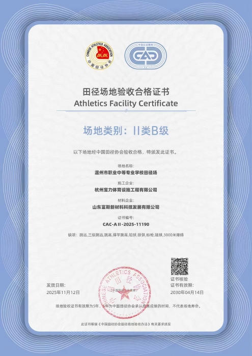 2025年11月,由杭州宝力体育设施工程有限公司承建的温州市职业中等专业学校400米田径场项目正式通过中国田径协会验收,荣获“II类B级田径场地合格证书”。该认证标志着场地在建设标准、材料工艺及运动性能上全面达到国家级专业要求,可承办全国Ⅳ级及以下田径赛事、群众体育竞赛及业余运动员等级达标活动,成为浙江省中职学校体育设施建设的标杆范例。