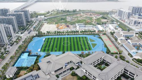 2024年由杭州宝力体育设施工程有限公司承建的舟山绿城南海实验学校400米透气型跑道项目,采用国际标准蓝色跑道搭配白色分道线;内设绿色人工草坪足球场,标线精准。周边配建红绿篮球场、标准化网球场及生态绿化带。